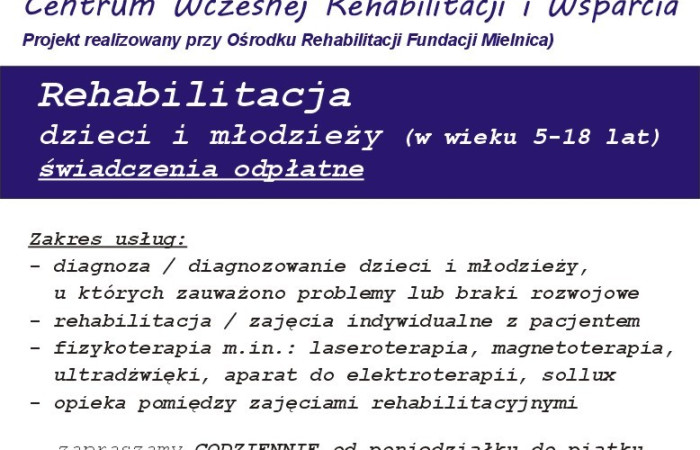 W ramach realizowanego projektu Centrum Wczesnej Rehabilitacji i Wsparcia działającego przy Ośrodku Rehabilitacji Fundacji „Mielnica” w Koninie, ul. Szpitalna 43 zapraszamy na REHABILITACJĘ DZIECI I MŁODZIEŻ w wieku 5-18 lat w ramach świadczeń odpłatnych.