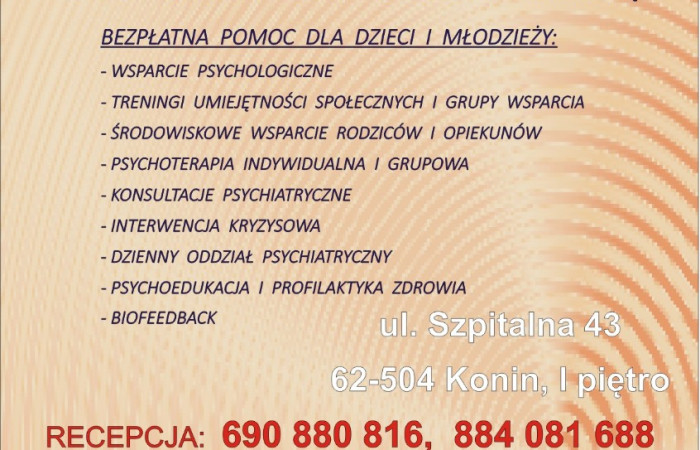 Środowiskowe Centrum Zdrowia Psychicznego dla dzieci i młodzieży do lat 18: ul. Szpitalna 43, 62-504 Konin.