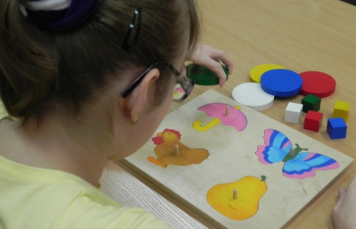 2. Płyta z wyciętymi figurami geometrycznymi: koło, kwadrat, trójkąt.