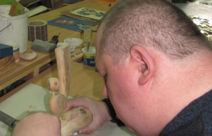 Pracownia techniczna - głównym materiałem, na którym pracujemy jest drewno i jego pochodne. Tniemy, szlifujemy, malujemy, oprawiamy obrazy, uczymy się drobnych napraw, które można wykorzystać później w pracach domowych. Naszymi wytworami są m.in. rzeźby i płaskorzeźby, ramki, podstawki, mozaiki ceramiczne i drewniane, witraże, stelaże do prac przestrzennych i inna drobna galanteria drewniana. Uczestnicy nabywają umiejętności posługiwania się narzędziami ręcznymi, urządzeniami elektrycznymi typu szlifierka, wiertarka, grawerka, wyrzynarka, wypalarka, tokarka, które są przeznaczone do obróbki drewna i materiałów drewnopodobnych oraz szkła i ceramiki. Wykonując takie czynności jak klejenie, posługiwanie się różnymi narzędziami np. ręczną wyrzynarką, wbijanie, dłutowanie, malowanie uczą się dokładności, cierpliwości, a także zaradności, ćwiczą sprawność manualną, dochodząc do pewnej precyzji przydatnej w życiu codziennym. Realizujemy pomysły uczestników, w wyniku których powstają przedmioty przydatne w ich domach rodzinnych. Staramy się, aby każdy robił to co lubi, bo pracuje wtedy najlepiej jak potrafi, ale również uczymy nowych technik, które z czasem stają się ulubionymi.