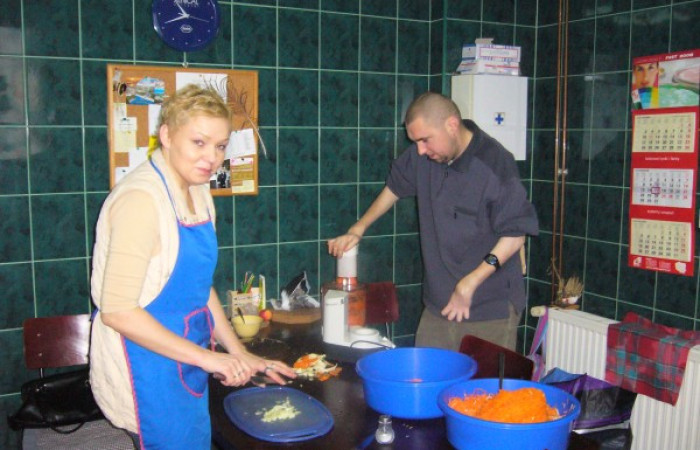 Pracownia gospodarstwa domowego - wszyscy bierzemy aktywny udział w zajęciach w niej prowadzonych. Jej ważna rola polega na tym, że każdy uczy się podstawowych zasad higieny dnia codziennego, propagujemy zdrowy styl życia z zakresu promocji zdrowia, doskonalimy umiejętności radzenia sobie w codziennym życiu, robimy zakupy, planujemy i układamy jadłospis a przede wszystkim, co ważne dla nas wszystkich, uczymy się przygotowywać posiłek dla siebie i pozostałych koleżanek i kolegów. Być może nie przygotujemy tortu orzechowego, pieczeni z jagnięcia, łososia po norwesku, ale pieczemy ciasta, pączki. Przygotowujemy sałatki, dania na ciepło... a zresztą - zwyczajna kanapka z serem i szynką podana i udekorowana przez kolegę jest pyszna. A za sałatą, pomidorem, ogórkiem i zieleniną przepadamy wszyscy. Uczymy się też przygotowywać posiłki okolicznościowe – śniadania Wigilijne, Wielkanocne - na których bywają goście nasi przyjaciele. Jest to wielka frajda dla wszystkich, a sporządzone potrawy, spożywane we wspólnym gronie są naprawdę „najlepsze” na świecie. I nigdzie nie zjecie takich wspaniałych potraw, wypieków jak u nas. A jeśli jakiś nasz solenizant zaskoczy nas niezapowiedzianą torebką cukierków, to zawsze jesteśmy w stanie coś przygotować na poczekaniu. Nie ma przecież rzeczy niemożliwych. Zapraszamy serdecznie.