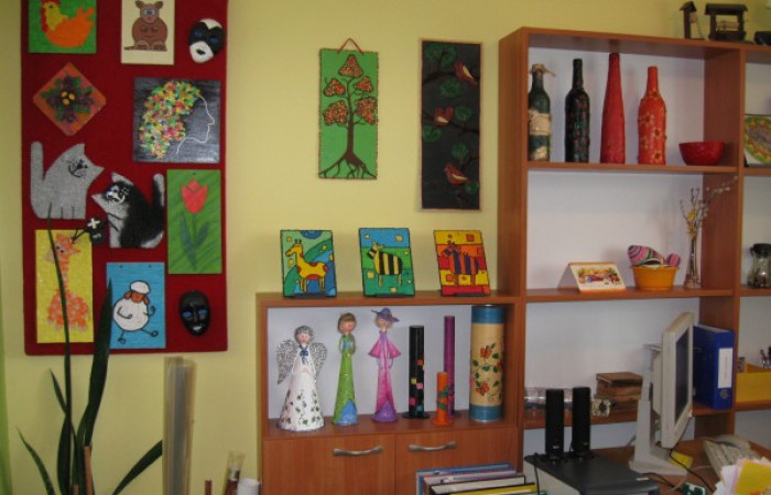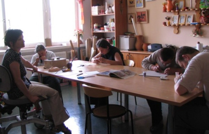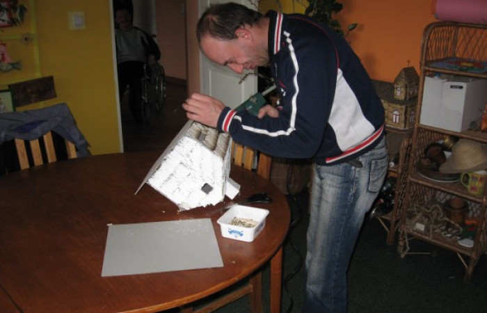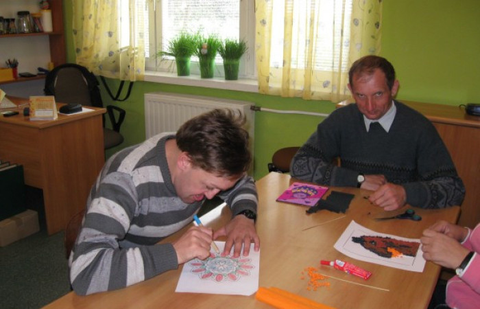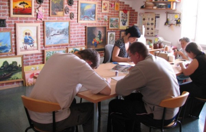- Pracowni artystycznej - celem prowadzonej terapii jest rozwijanie aktywności twórczej oraz podnoszenie sprawności manualnej uczestników. Prowadzona arteterapia służy rozwojowi wyobraźni, uwrażliwieniu na otaczający świat, kształtuje poczucie ładu i piękna. Sztuka, która powstaje, jest alternatywną formą komunikacji, a jej tworzenie wycisza, otwiera i wyzwala z napięć wewnętrznych, które wywołuje trudna niekiedy codzienność. W pracowni powstają różnego rodzaju prace plastyczne: obrazy, wyklejane mozaiki, malowane odlewy gipsowe, a także wyszywane serwety, przedmioty ozdabiane techniką decoupage. Ich wykonanie wymaga od uczestników wiele cierpliwości i dokładności, ale efekty dają prawdziwą satysfakcję i wzmacniają poczucie własnej wartości. Ponadto w pracowni artystycznej dokonuje się renowacji zabytkowych figurek.